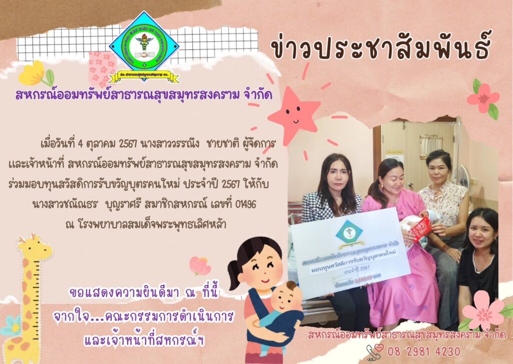 เมื่อวันที่ 4 ตุลาคม 2567 นางสาววรรณภัช ชายชาติ ผู้จัดการและเจ้าหน้าที่ สหกรณ์ออมทรัพย์สาธารณสุขสมุทรสงคราม จำกัดร่วมมอบทุนสวัสดิการรับขวัญบุตรคนใหม่ ประจำปี 2567 ให้กับนางสาวชนิสรา บุญชูศรี สมาชิกสหกรณ์ เลขที่ 01496ณ โรงพยาบาลสมเด็จพระพุทธเลิศหล้า