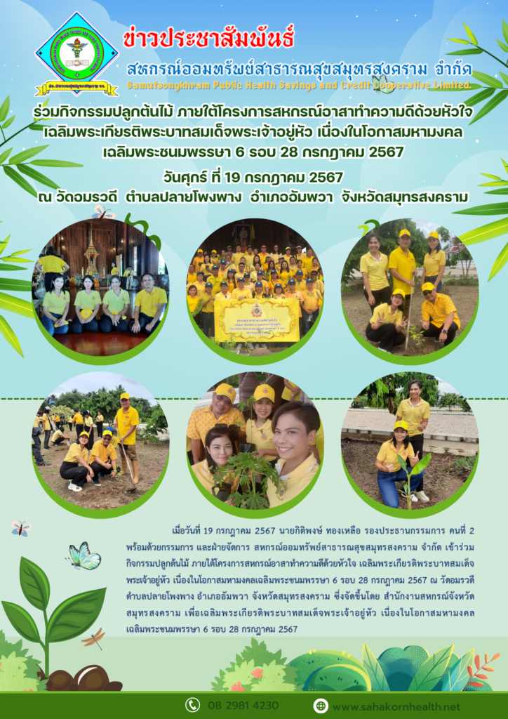 ร่วมกิจกรรมปลูกต้นไม้ ภายใต้โครงการสหกรณ์อาสาทำความดีด้วยหัวใจเฉลิมพระเกียรติพระบาทสมเด็จพระเจ้าอยู่หัว เนื่องในโอกาสมหามงคลเฉลิมพระชนมพรรษา 6 รอบ 28 กรกฎาคม 2567