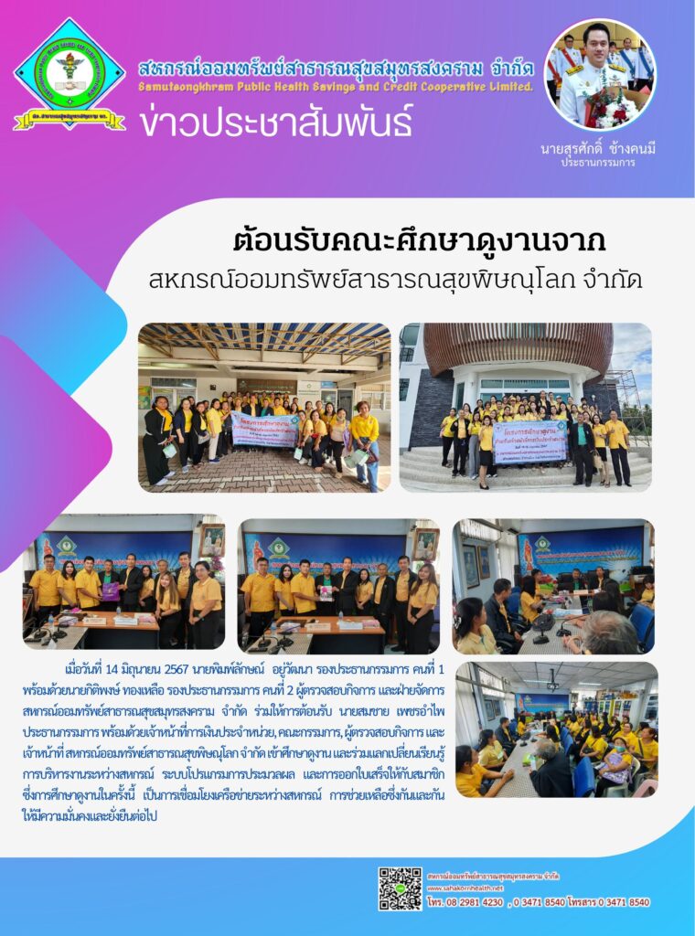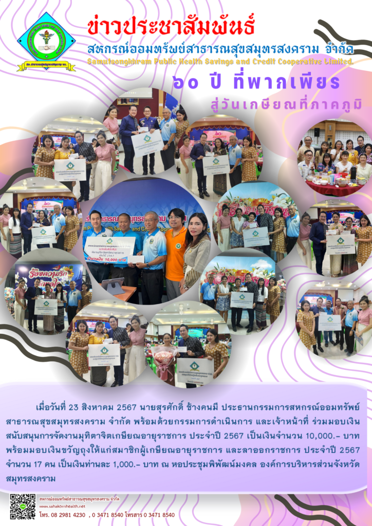 เมื่อวันที่ 23 สิงหาคม 2567 นายสรศักดิ์ ช้างคนมี ประธานกรรมการสหกรณ์ออมทรัพย์สาธารณสุขสมุทรสงคราม จำกัด พร้อมด้วยกรรมการดำเนินการ และเจ้าหน้าที่ ร่วมมอบเงินสนับสนุนการจัดงานมุทิตาจิตเกษียณอายุราชการ ประจำปี 2567 เป็นเงินจำนวน 10,000.- บาท พร้อมมอบเงินขวัญถุงให้แก่สมาชิกผู้เกษียณอายุราชการ และลาออกจากราชการ ประจำปี 2567 จำนวน 17 คน เป็นเงินท่านละ 1,000.-…