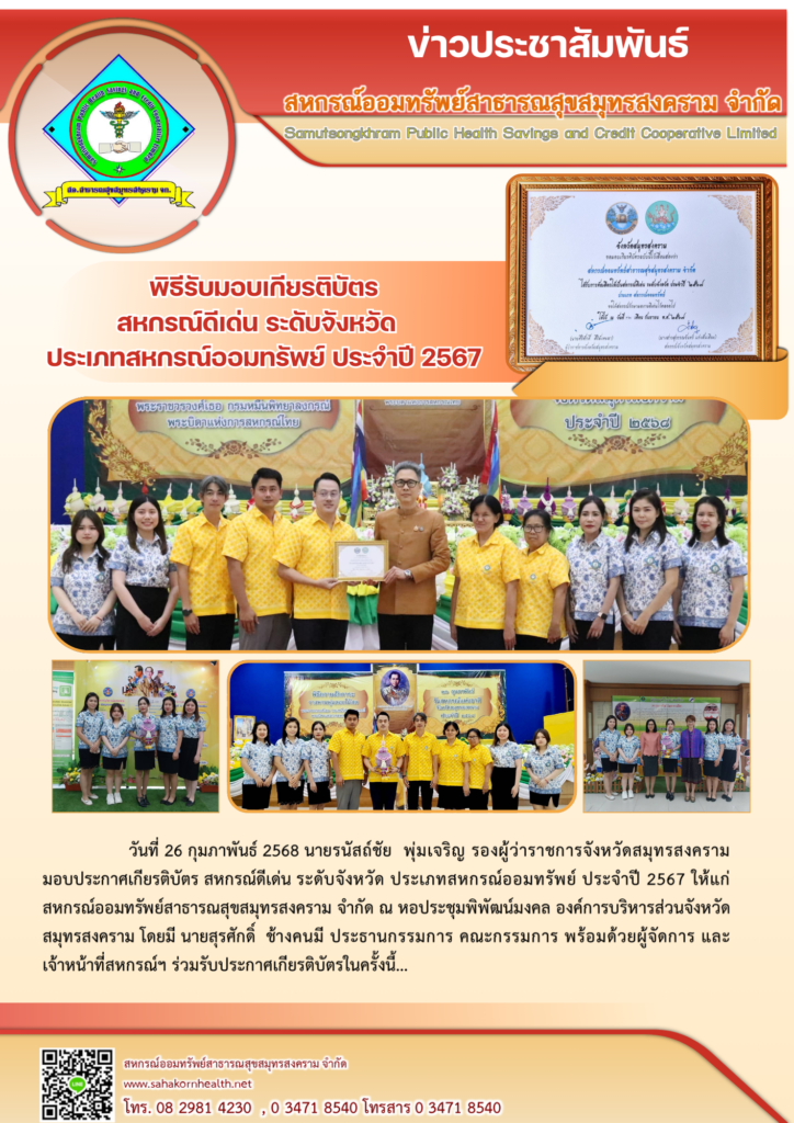 วันที่ 26 กุมภาพันธ์ 2568 นายรณชัย พุ่มเจริญ รองผู้ว่าราชการจังหวัดสมุทรสงครามมอบประกาศเกียรติบัตร สหกรณ์ดีเด่น ระดับจังหวัด ประเภทสหกรณ์ออมทรัพย์ประจำปี 2567 ให้แก่ สหกรณ์ออมทรัพย์สาธารณสุขสมุทรสงคราม จำกัดณ หอประชุมพัฒนมงคล องค์การบริหารส่วนจังหวัดสมุทรสงคราม โดย นายสรศักดิ์ ช้างคนมี ประธานกรรมการ คณะกรรมการ พร้อมด้วยผู้จัดการและเจ้าหน้าที่สหกรณ์ฯ ร่วมรับประกาศเกียรติบัตรในครั้งนี้…